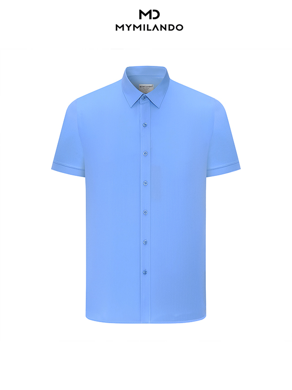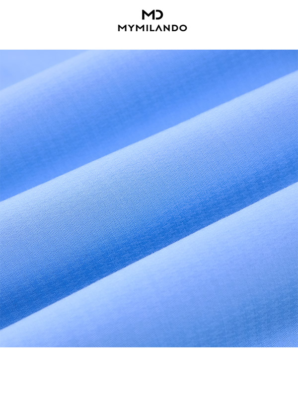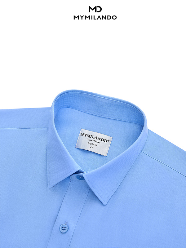 Màu sắc & Họa tiết: Màu xanh dương tươi sáng kết hợp với họa tiết dệt chìm tạo chiều sâu, giúp chiếc áo không bị đơn điệu như các loại sơ mi trơn thông thường.