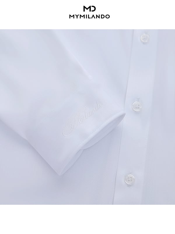 Chi tiết: Cổ áo thiết kế bản vừa, ép keo công nghệ cao để luôn cứng cáp. Măng-set tay áo thêu logo Milando khẳng định thương hiệu.